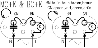 K (klixon): in serie geplaatst met de motor, het is een element die opwarmt door de stroom die erdoor loopt, de warmte veroorzaakt dan het openen van een schakelaar die de motor dus van de voeding ontkoppelt. Als tijdens het starten de motor klem is, zal zijn stroom boven nominaal zijn en de schakelaar zal de motor uitschakelen. Men moet op de rode knop duwen om te herstarten.